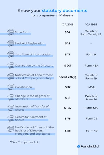 The SSM has published a detailed explanation in the introduction of the Companies Act 2016. You can check out the clarifications on the old and new statutory documents which are listed in Schedule A, B, and C together with attached sample documents. Here's a summary of some essential statutory documents of your company that you should know.